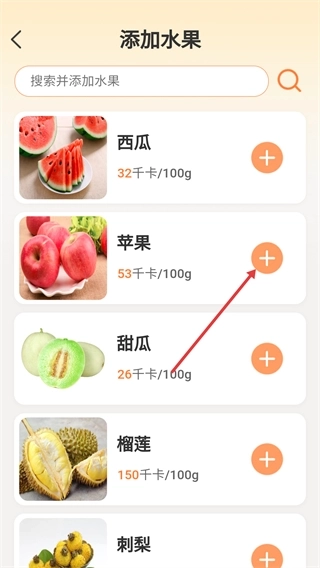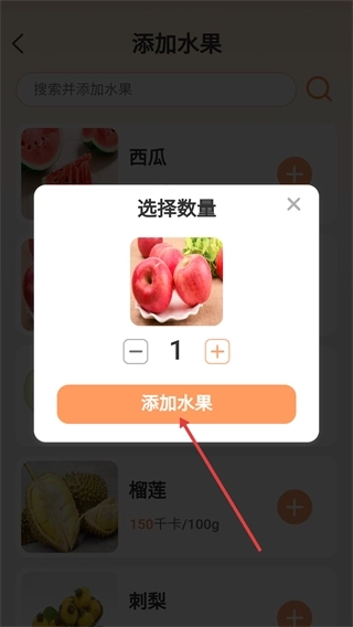 进入【添加水果】页面后,挑选想要的水果(例如【苹果-53千卡/100g】),接着点击该水果右侧的“+”号,就能进入数量选择的步骤。