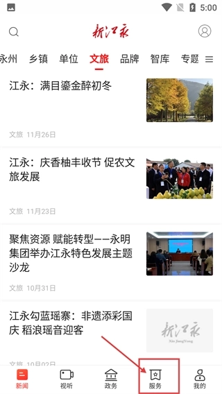 1、进入【新江永】的【文旅】板块页面,能够浏览文旅相关资讯,点击底部导航栏的【服务】选项,即可进入对应的服务功能页面。