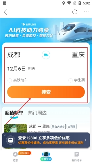 3、进入【查火车票】页面,将出发地设置为【成都】、目的地设置为【重庆】并选定日期后,点击【搜索】按钮即可查询相应车次。