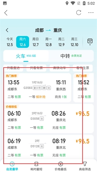 4、进入车次搜索结果页面后,能借助【只看直达】这类筛选条件,查看各个车次的票务情况,挑选合适的车次开展后续操作。