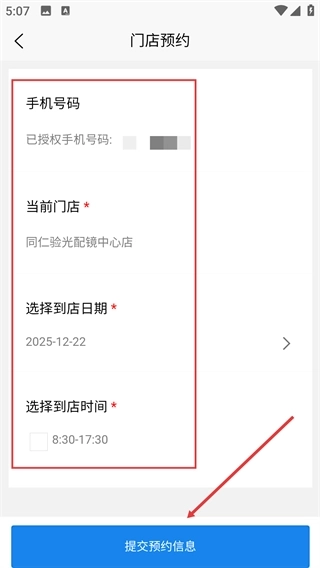 4、进入【门店预约】页面后,先确认【当前门店】的相关信息,接着选择好【到店日期】与【到店时间】,最后点击【提交预约信息】按钮,即可完成整个操作流程。