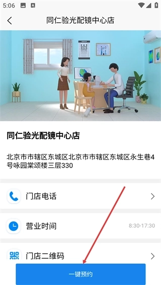 3、进入【同仁验光配镜中心店】的详情页面后,能够查看门店地址等相关信息,点击页面底部的【一键预约】按钮即可发起预约。