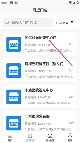 2、在【附近门店】页面,既可以在搜索框中输入门店名称进行查找,也能够查看列表里像【同仁验光配镜中心店】这类门店的营业时间和距离信息。