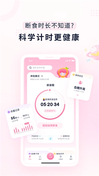 可以自主记录个人的体重、热量摄入以及断食时长等信息。