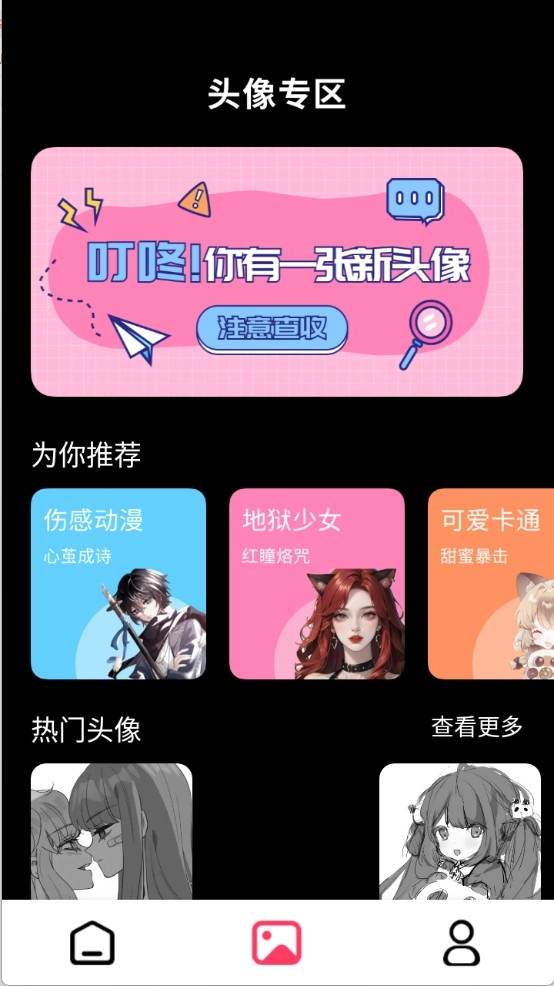 “头像”页面,可爱头像、动漫头像等都有。