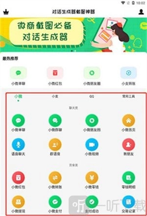 1、打开对话生成器截图神器免费版软件后,能看到多样的功能选项,其中在小微板块里包含了小微单聊、小微群聊、朋友圈、语音聊天等功能。