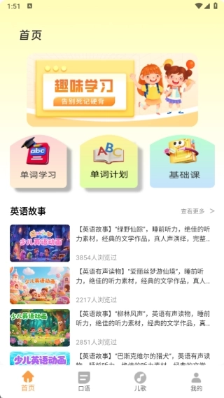 1、首页设有单词学习、单词计划、基础课等功能板块,你可以在这里学习英语知识,同时还能浏览各类精彩的英语故事。