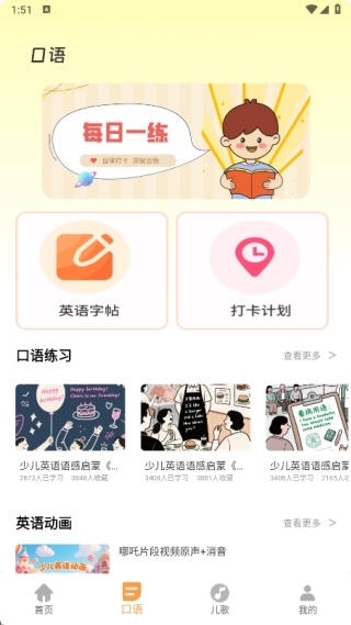 3、在口语页面中,我们提供英语字帖与打卡计划,帮助用户更好地进行口语练习,同时还能了解英语动画相关内容。