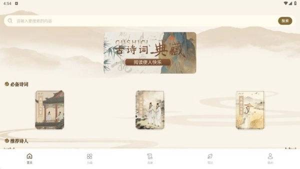 1、在首页浏览必备诗词、推荐词人等板块的内容,阅读诗词。