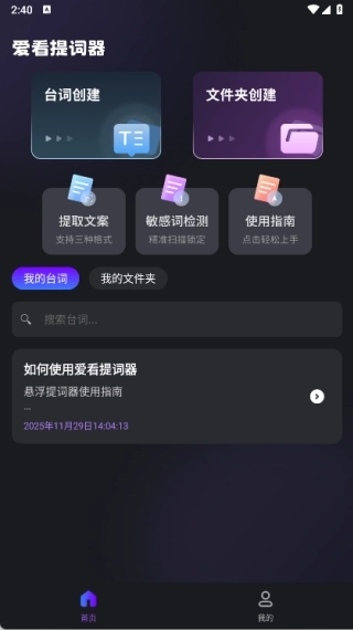 1、首页支持台词创建与文件夹创建功能,此外还提供文案提取、敏感词检测以及使用指南等服务。