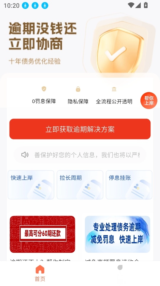 支持用户合法合规的处理自己逾期的债务,轻松避免高额违约金,实时保障用户的权益。