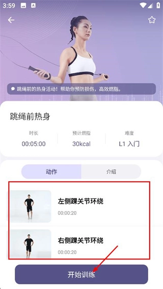 4、进入课程详情页面后,点击“开始训练”按钮,即可开启跳绳前的热身训练环节。