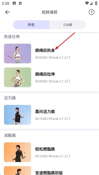 3、进入视频课程页面后,找到并点击跳绳前热身课程,即可进入该课程的详情页面。