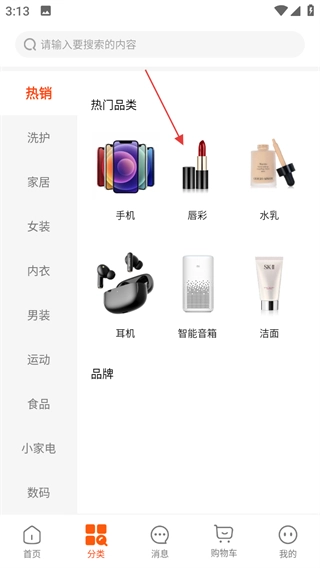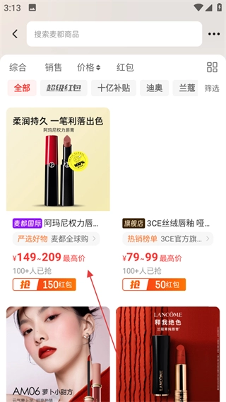 在分类页面,点击唇彩,进入唇彩商品列表页面。