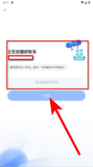 在新账号创建页面,设置至少8位的登录密码后点击完成,就能完成账号注册。