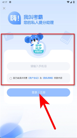 在登录注册页面,输入手机号码,勾选相关选项后点击登录注册按钮。