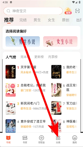 打开奇迹文学应用,找到底部导航栏的“分类”选项并点击,即可进入小说分类页面。