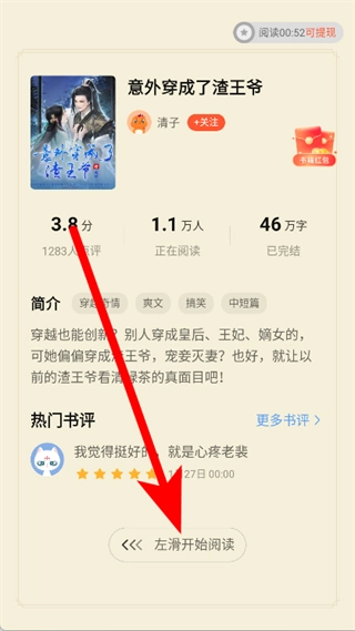 点击目标小说进入详情页面,浏览简介、评分等信息后,向左滑动即可开始阅读。