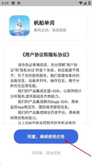 在用户协议与隐私协议页面点击同意后,即可继续使用应用并进入主界面。