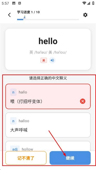 在单词学习页面,选对中文释义后点击继续,就能查看该单词的详细内容。