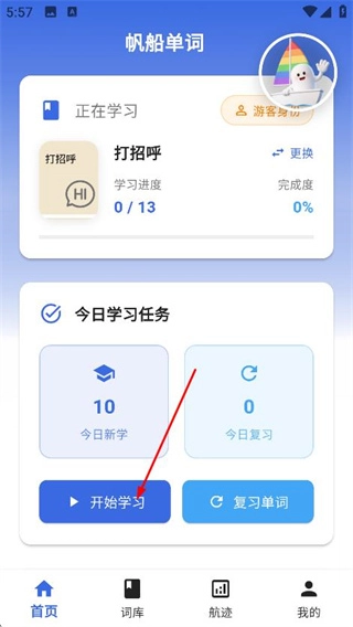 在帆船单词的主界面,点击“开始学习”按钮,即可进入单词学习页面。