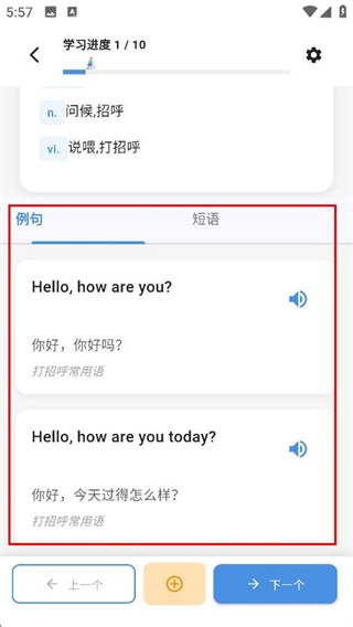 在单词详情页面,你可以查看该单词的例句等相关信息,并且能够点击“下一个”按钮继续学习下一个单词。