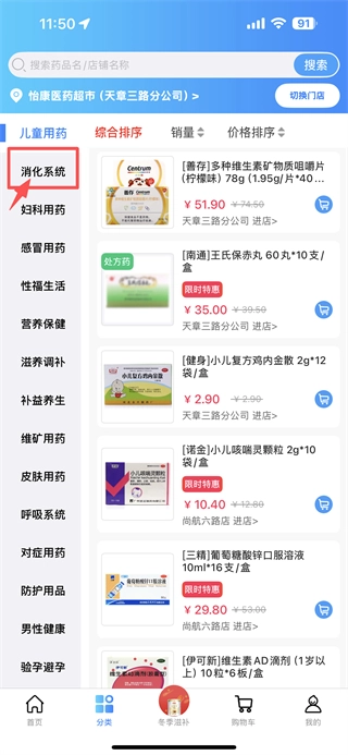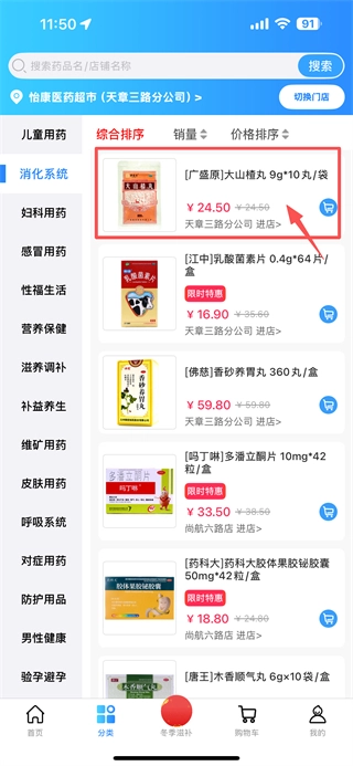 在分类页面,点击消化系统选项,即可进入消化系统药品列表页。