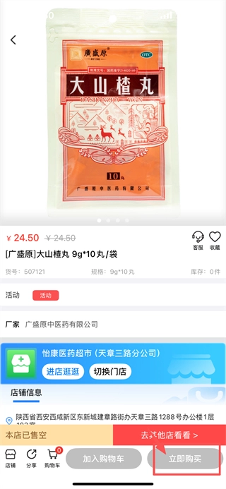 4、在药品详情页面,点击“立即购买”按钮,即可开展该药品的购买流程。
