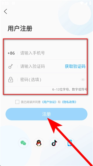 在注册页面依次输入手机号与验证码,密码为选填项,完成上述操作后勾选相关选项,最后点击注册按钮即可。