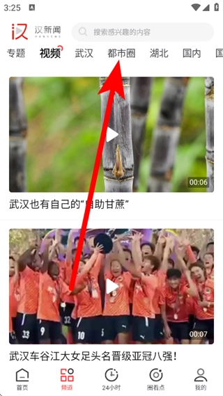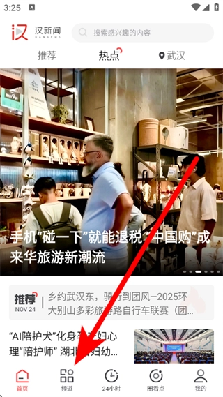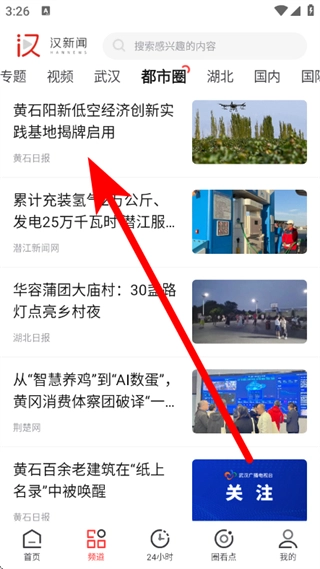 打开汉新闻,点击底部频道,进入频道管理页面。