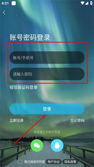 在账号密码登录页面输入账号手机号与密码,勾选相关协议后点击登录按钮,即可完成账号登录流程。