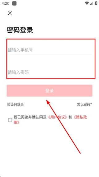 在密码登录界面输入手机号与密码,勾选相关协议后,点击登录按钮即可完成账号登录流程。