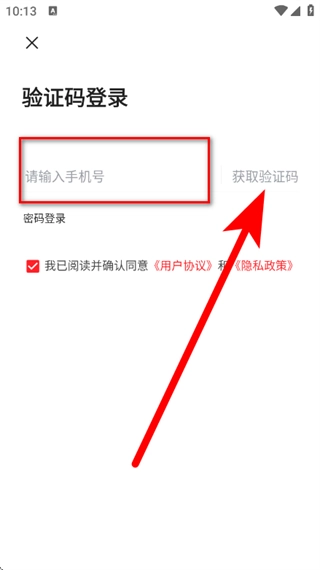 3、输入手机号,勾选同意后,点击获取验证码。