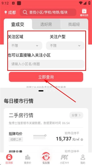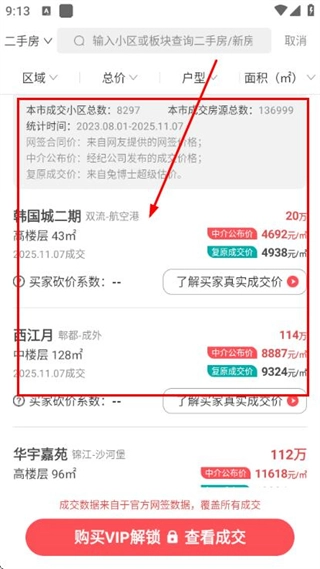 1在成交查询界面,可通过选定具体区域、指定房屋户型,或是输入目标小区名称、商圈范围等方式设置筛选条件,随后点击查询按钮,即可获取对应的成交数据。