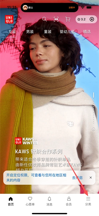 1、打开优衣库首页后,点击页面底部导航栏里的分类按钮,就能进入商品分类页面。