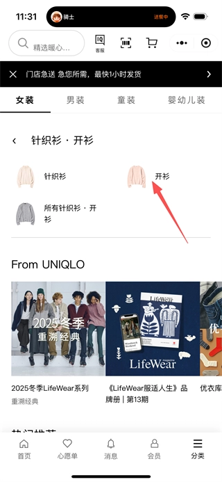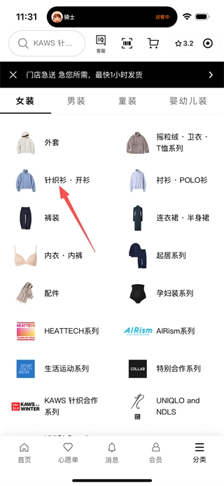 2、进入商品分类页面后,点击“针织衫开衫”选项,即可跳转至针织衫·开衫分类页面。