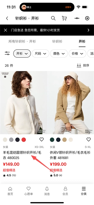 3、在针织衫·开衫分类页面,点击开衫选项,即可进入开衫商品列表页面。