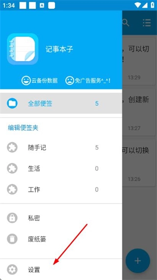 在便签的全部页面中,点击左上角的菜单按钮,即可打开侧边栏菜单。