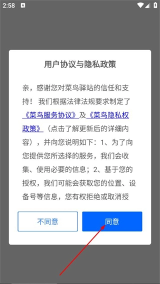 1、在驿站掌柜弹出的用户协议与隐私政策窗口里,点击同意按钮,即可进入登录页面。