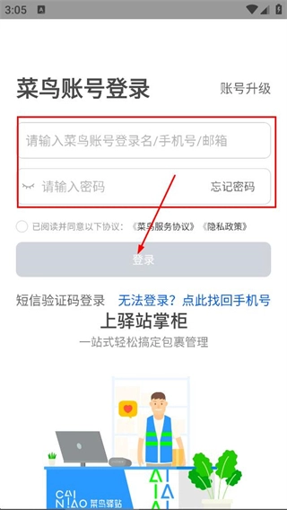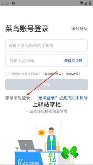 2、进入菜鸟账号登录页面后,点击“账号密码登录”选项,即可切换到密码登录界面。