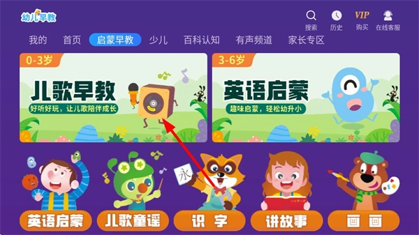 1、在幼儿早教首页,点击启蒙早教选项,进入启蒙早教分类页面。