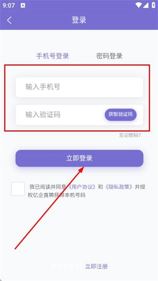 3、在登录界面输入手机号与验证码,勾选相关协议后,点击“立即登录”按钮,即可完成账号登录流程。