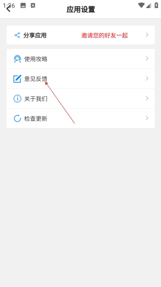 3、进入应用设置界面后,找到并点击【意见反馈】选项,即可进入意见反馈界面。