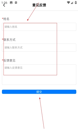 4、进入意见反馈界面后,依次填写【姓名、联系方式、反馈意见】这三项内容,再点击【提交】按钮,就能完成意见反馈的操作流程。
