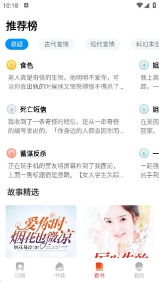 3、点击“看书”选项后,你会看到推荐榜单,同时也能根据不同题材来挑选书籍阅读。