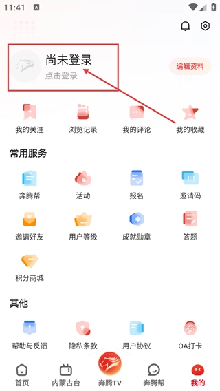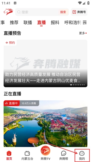 1、在奔腾融媒首页点击底部的【我的】按钮,首页包含直播、联播等板块,点击后可进入个人中心页面。