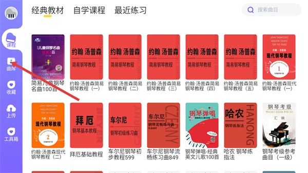 1、点击应用左侧导航栏的【曲库】选项,进入曲库页面后,就能浏览各类钢琴教材以及曲目资源。
