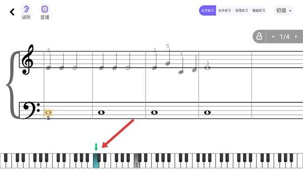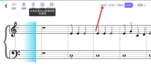 3、进入乐谱界面后,点击顶部的【左手练习】选项,即可切换到左手单独练习模式。