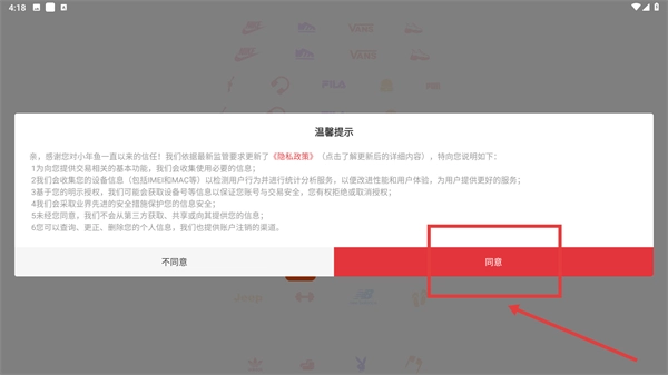 1、当弹出【温馨提示】弹窗时,点击【同意】按钮以确认接受《隐私政策》,从而继续后续的应用进入流程。
