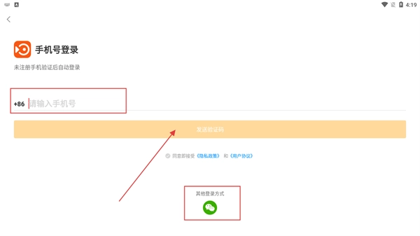 2、进入【手机号登录】页面后,填写手机号码,既可以选择点击【发送验证码】通过短信验证完成登录,也能够借助【其他登录方式】中的微信登录来操作。
